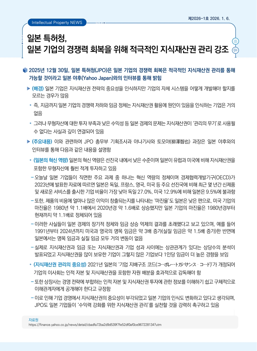 일본 특허청, 일본 기업의 경쟁력 회복을 위해 적극적인 지식재산권 관리 강조