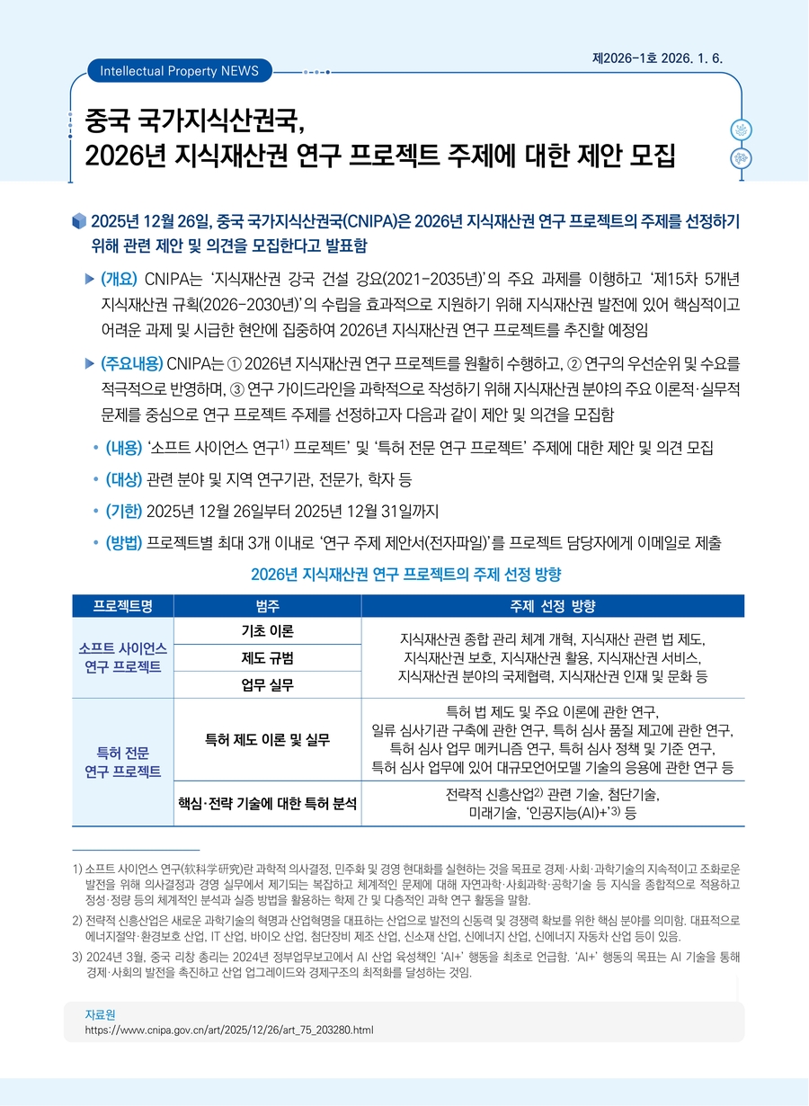 중국 국가지식산권국, 2026년 지식재산권 연구 프로젝트 주제에 대한 제안 모집