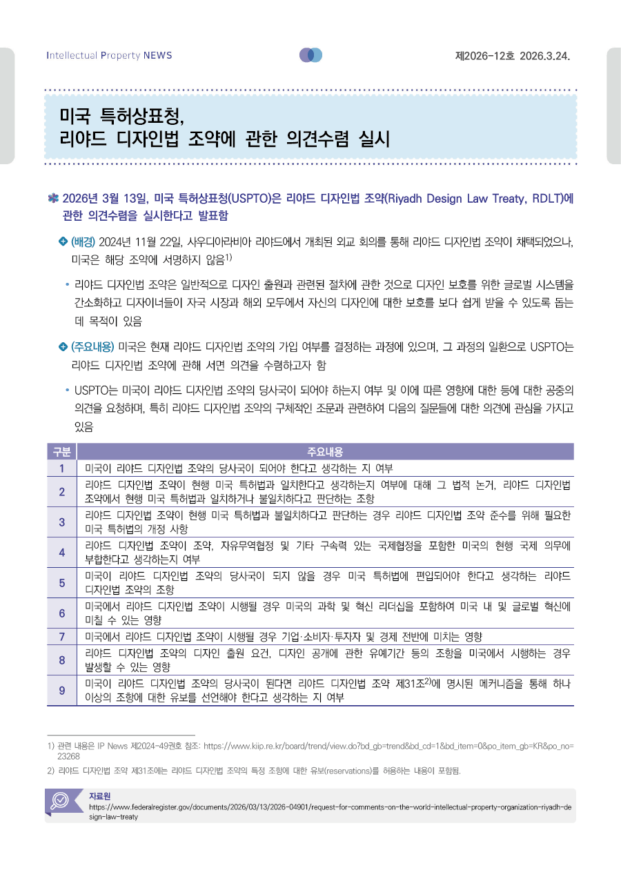 미국 특허상표청, 리야드 디자인법 조약에 관한 의견수렴 실시