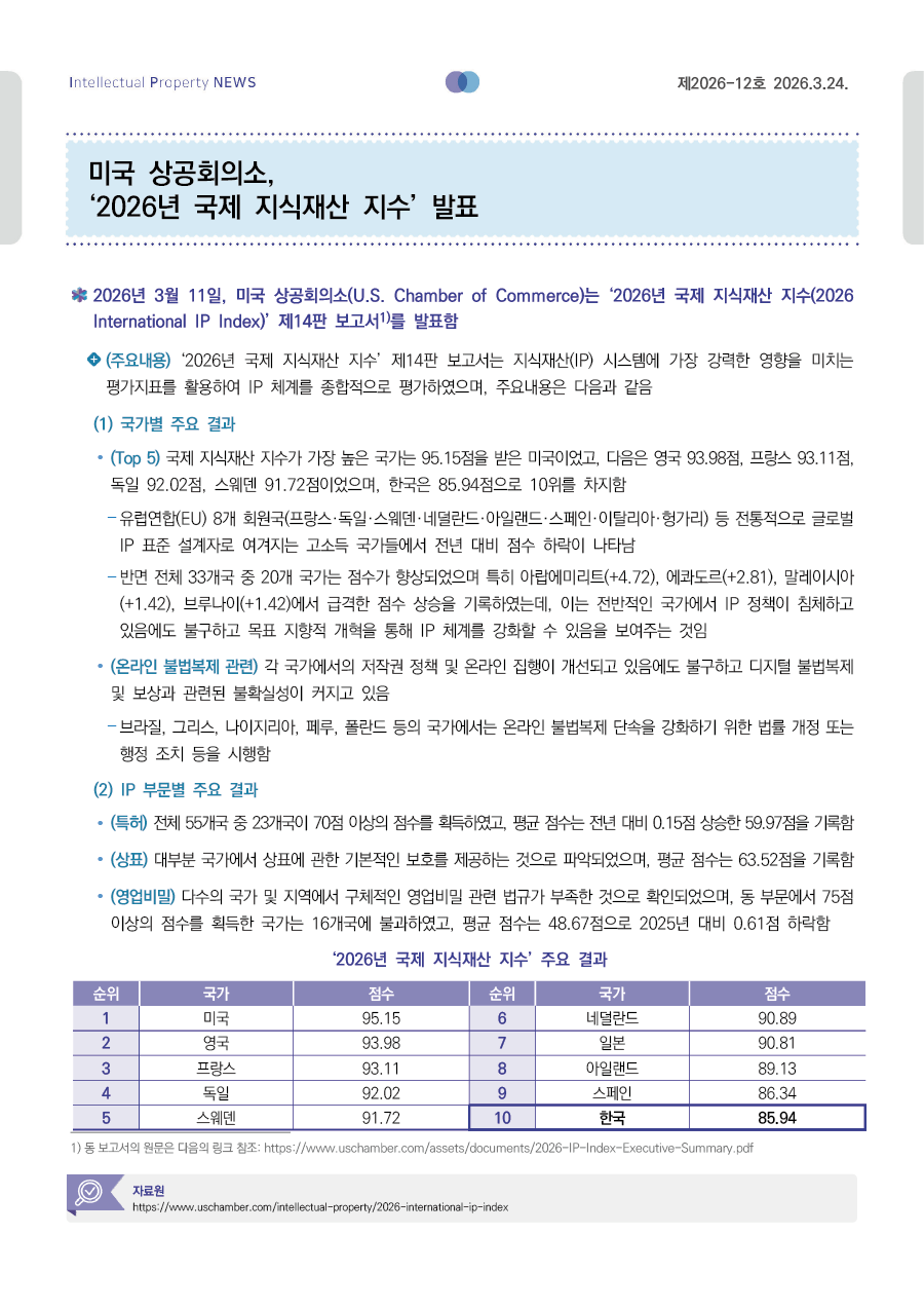 미국 상공회의소, ‘2026년 국제 지식재산 지수’ 발표