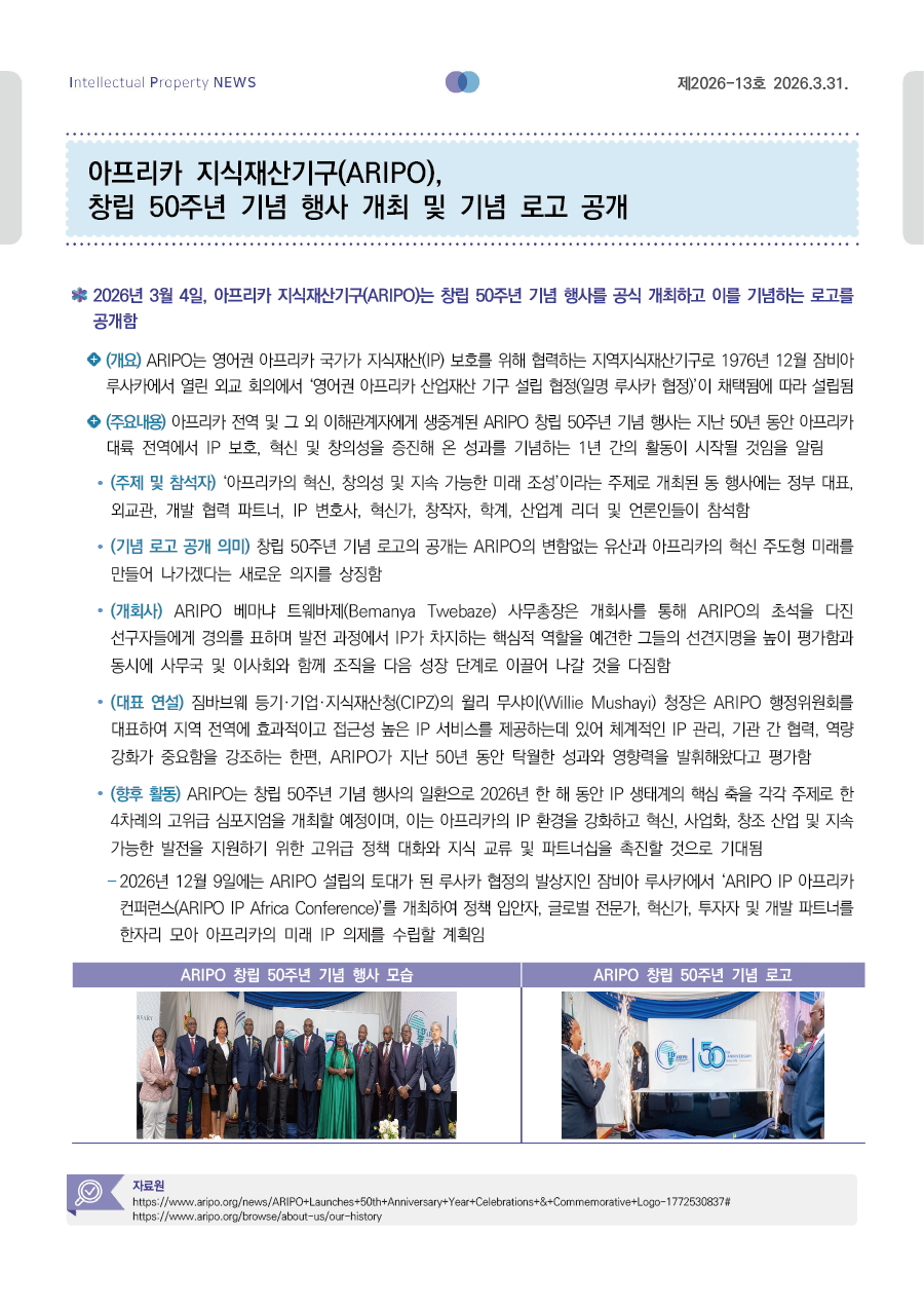 아프리카 지식재산기구(ARIPO), 창립 50주년 기념 행사 개최 및 기념 로고 공개