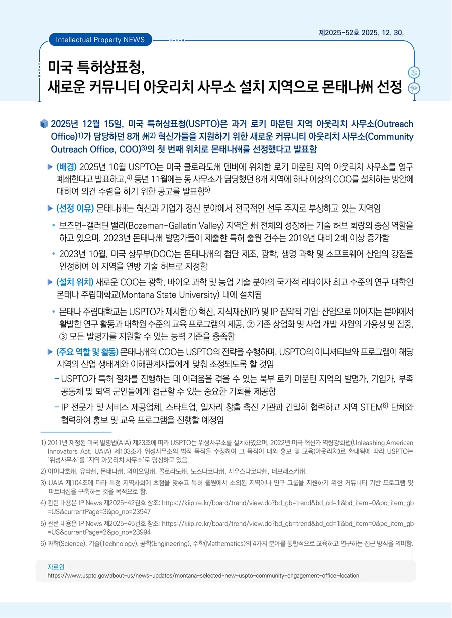 미국 특허상표청, 새로운 커뮤니티 아웃리치 사무소 설치 지역으로 몬태나州 선정