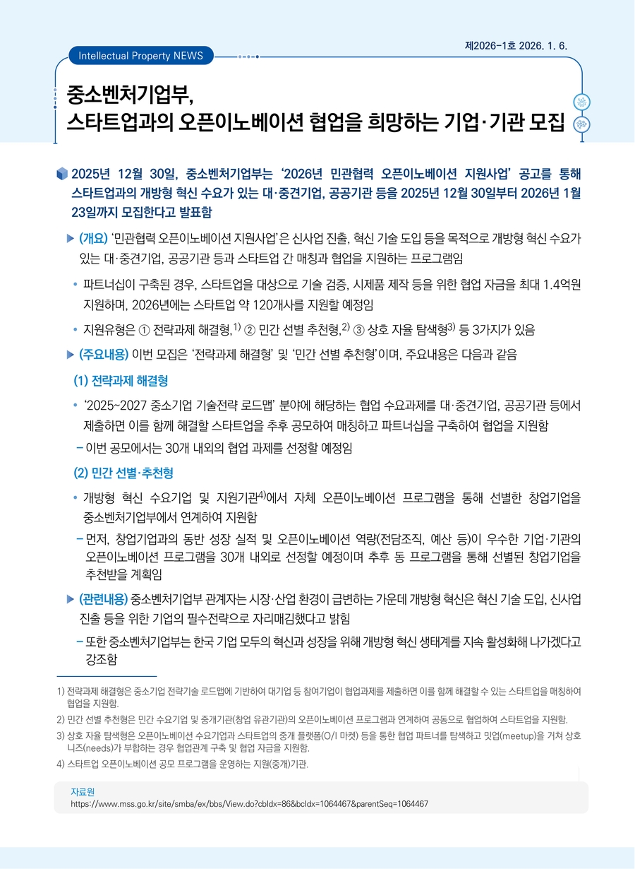중소벤처기업부, 스타트업과의 오픈이노베이션 협업을 희망하는 기업·기관 모집