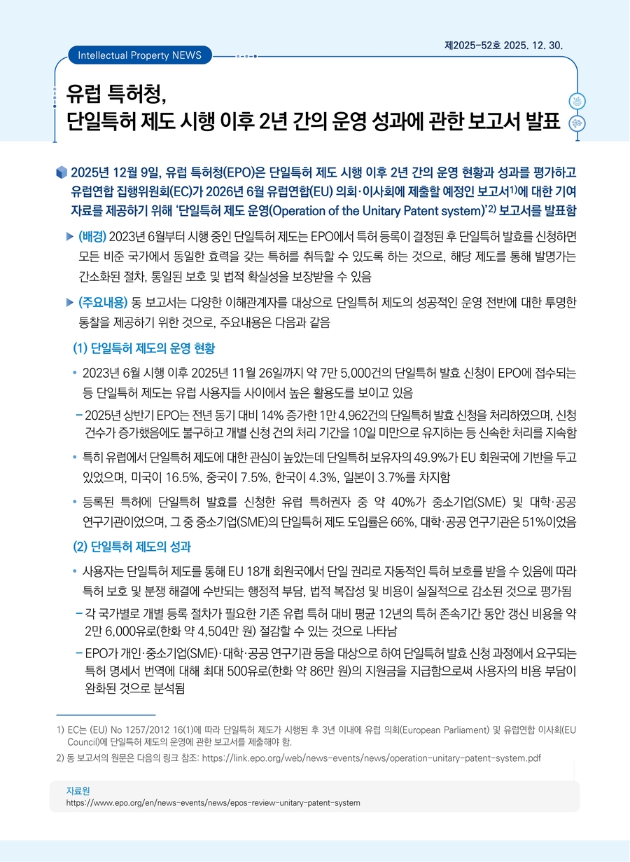 유럽 특허청, 단일특허 제도 시행 이후 2년 간의 운영 성과에 관한 보고서 발표
