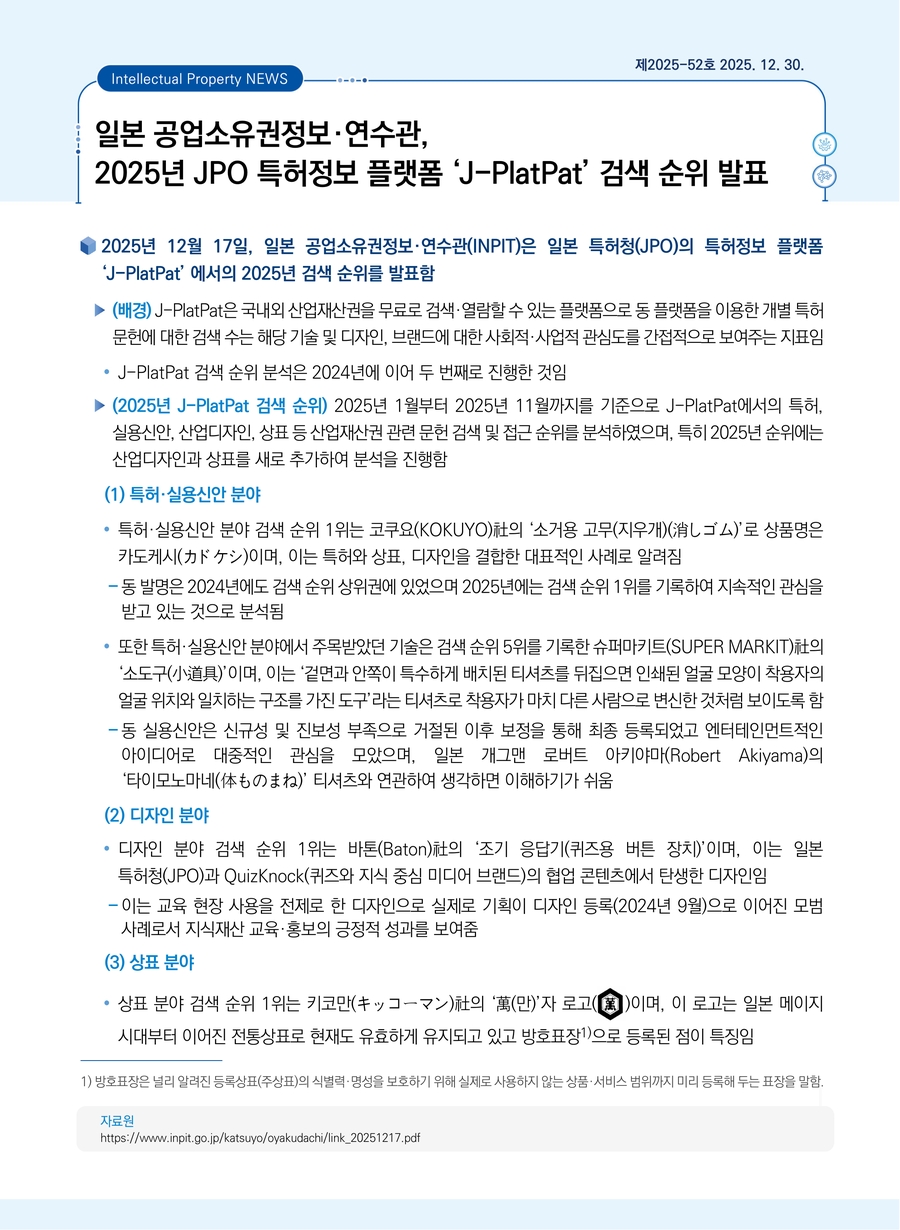 | 일본 공업소유권정보·연수관, 2025년 JPO 특허정보 플랫폼 ‘J-PlatPat’ 검색 순위 발표 |