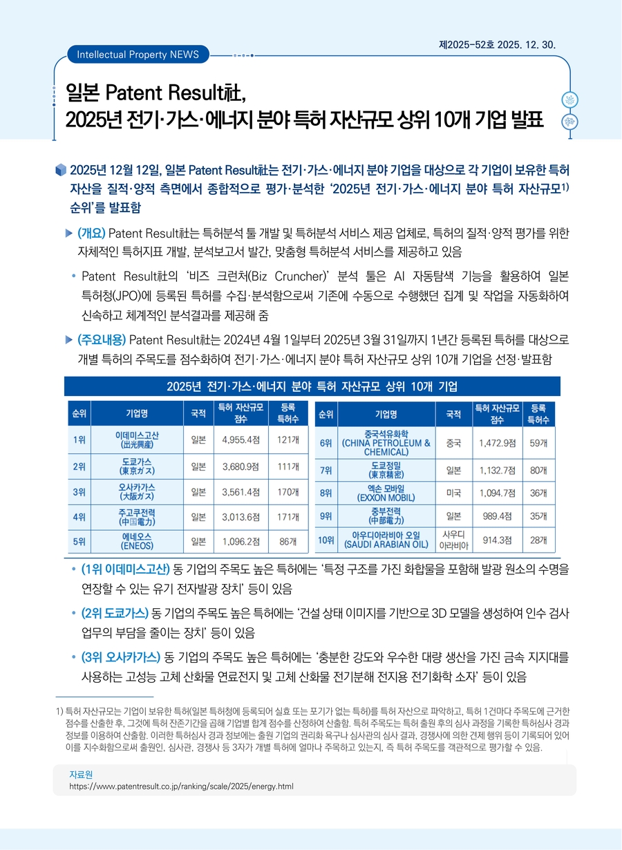 | 일본 Patent Result社, 2025년 전기·가스·에너지 분야 특허 자산규모 상위 10개 기업 발표 |