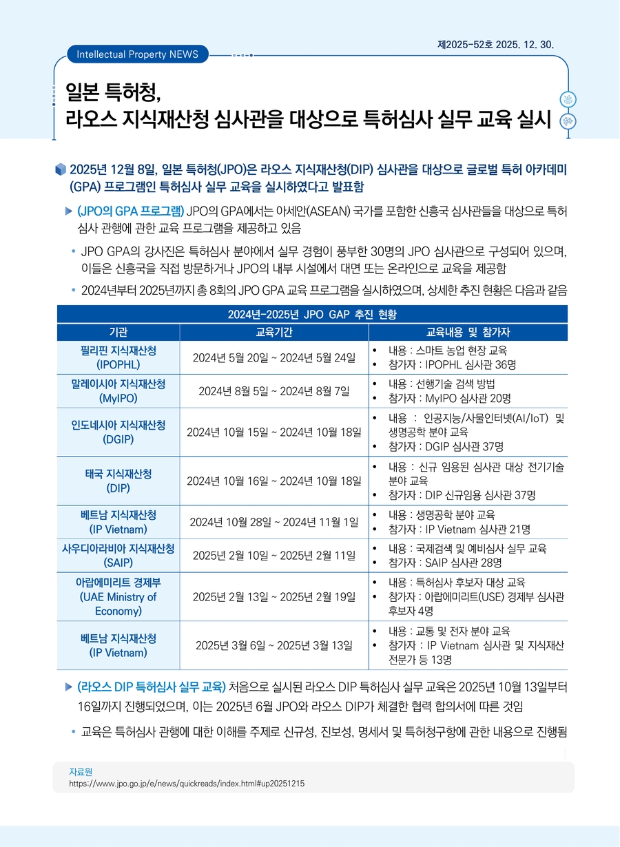 일본 특허청, 라오스 지식재산청 심사관을 대상으로 특허심사 실무 교육 실시