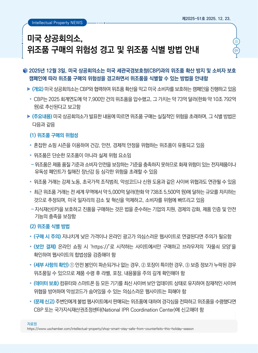 미국 상공회의소, 위조품 구매의 위험성 경고 및 위조품 식별 방법 안내