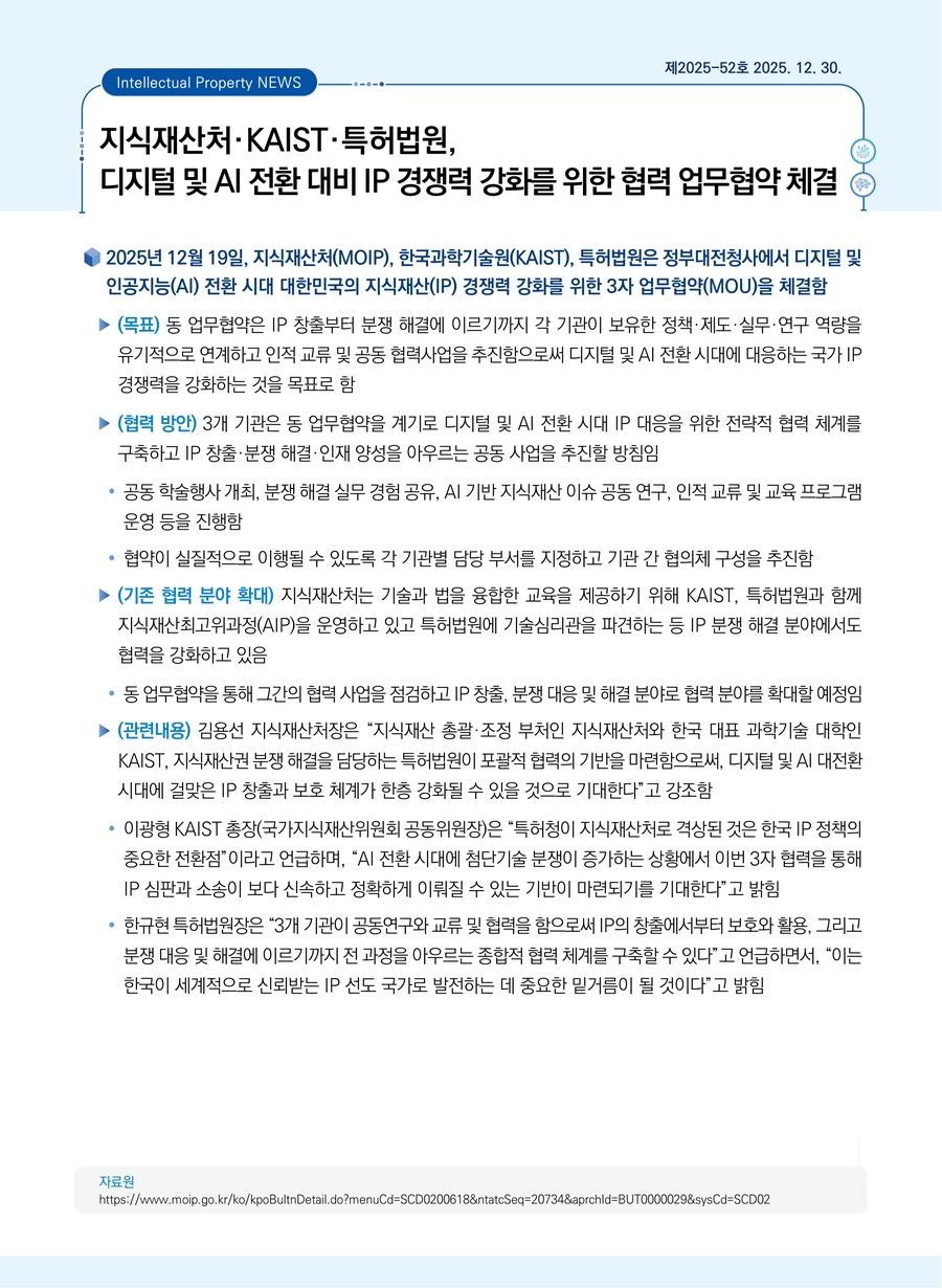 | 지식재산처·KAIST·특허법원, 디지털 및 AI 전환 대비 IP 경쟁력 강화를 위한 협력 업무협약 체결 |