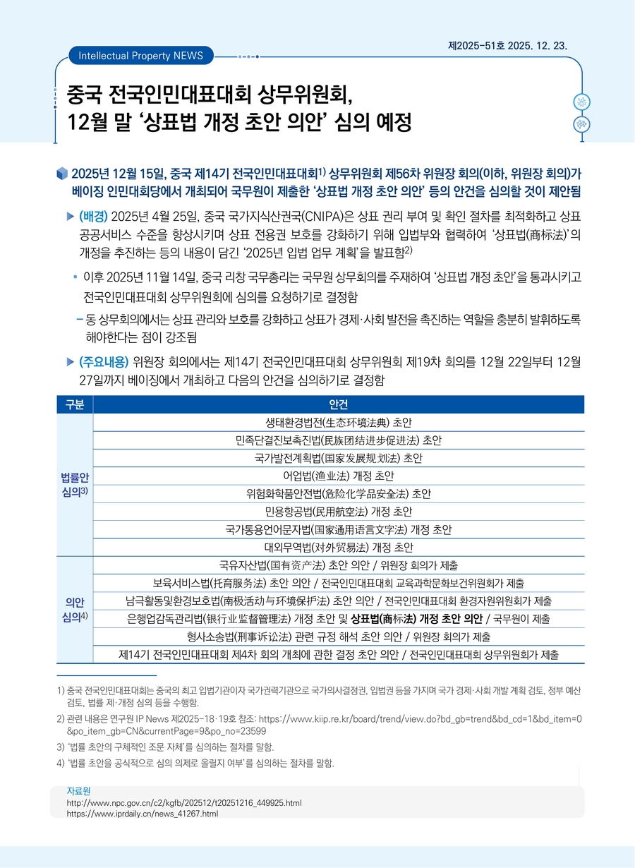 중국 전국인민대표대회 상무위원회, 12월 말 ‘상표법 개정 초안 의안’ 심의 예정