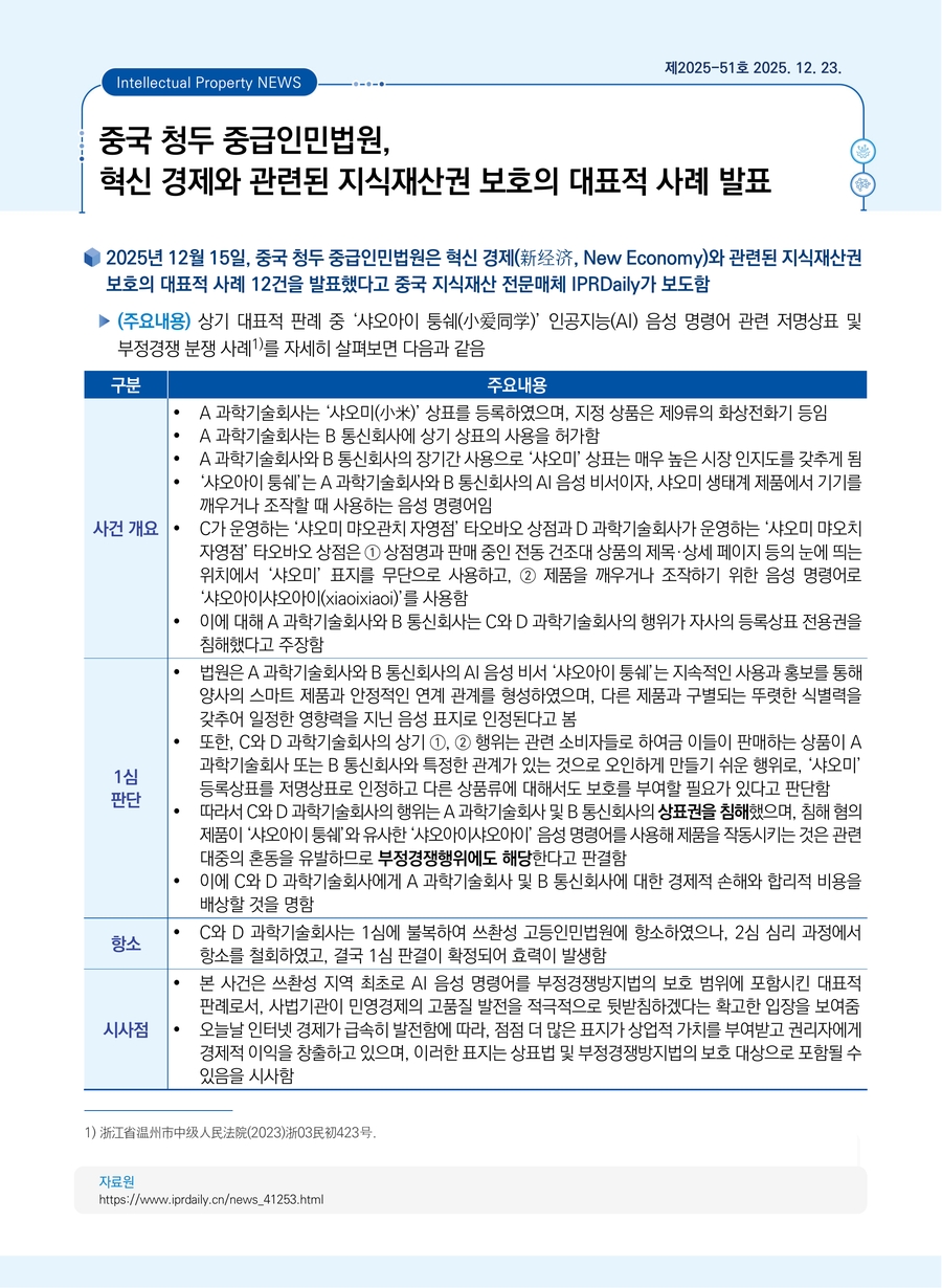 중국 청두 중급인민법원, 혁신 경제와 관련된 지식재산권 보호의 대표적 사례 발표