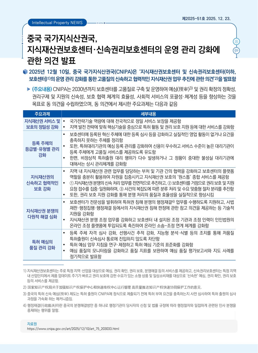 중국 국가지식산권국, 지식재산권보호센터·신속권리보호센터의 운영 관리 강화에 관한 의견 발표