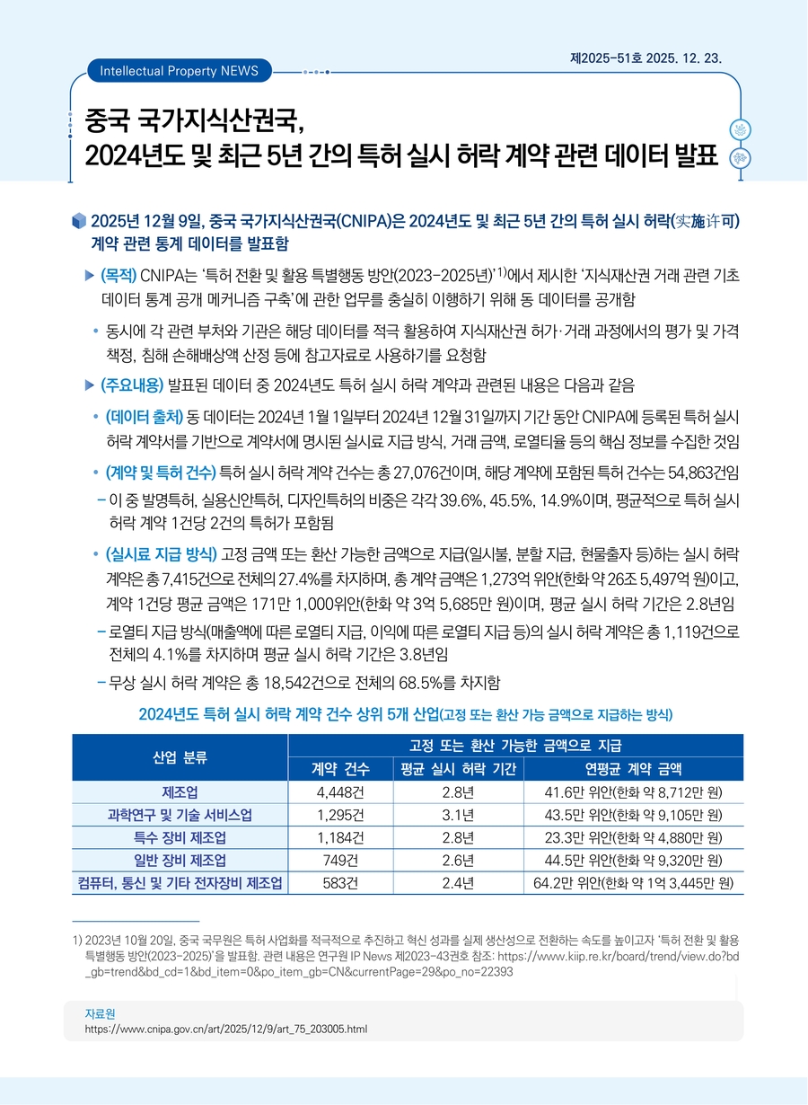 중국 국가지식산권국, 2024년도 및 최근 5년 간의 특허 실시 허락 계약 관련 데이터 발표