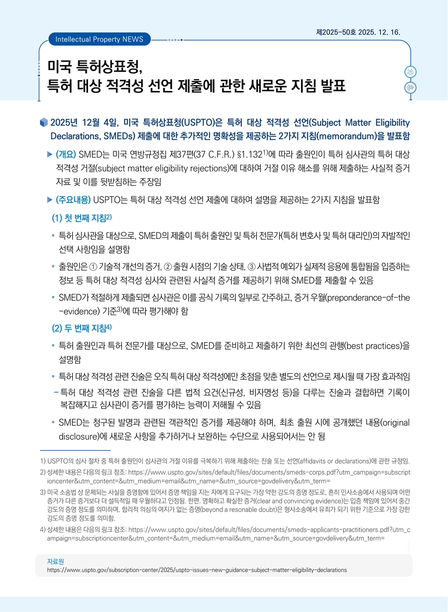 미국 특허상표청, 특허 대상 적격성 선언 제출에 관한 새로운 지침 발표
