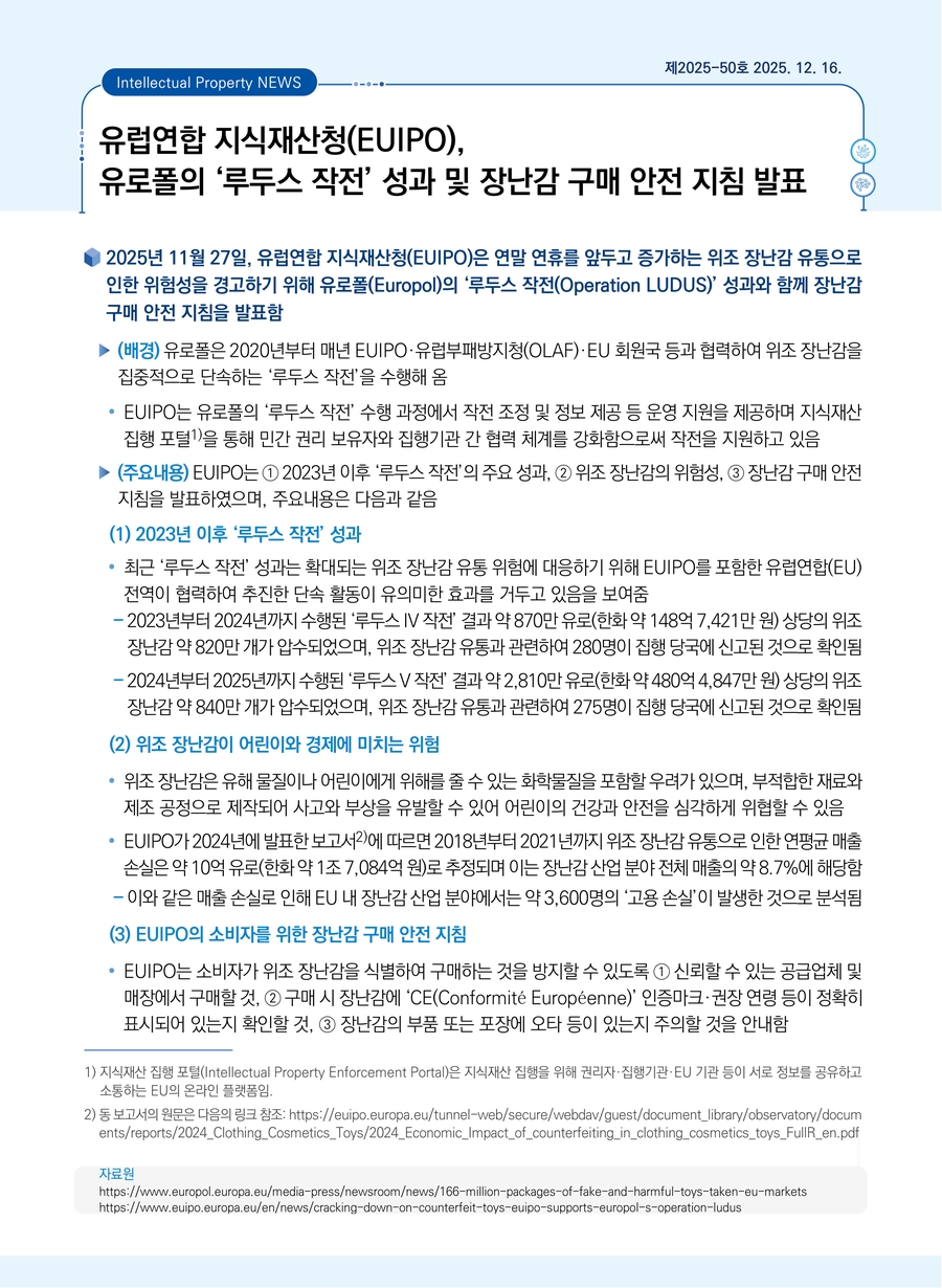 | 유럽연합 지식재산청(EUIPO), 유로폴의 ‘루두스 작전’ 성과 및 장난감 구매 안전 지침 발표 |