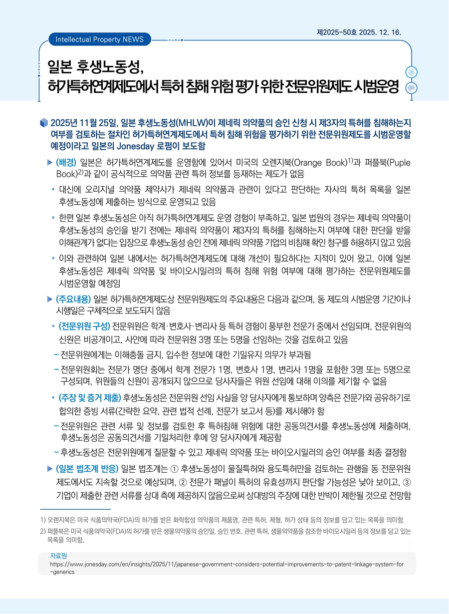 일본 후생노동성, 허가특허연계제도에서 특허 침해 위험 평가 위한 전문위원제도 시범운영
