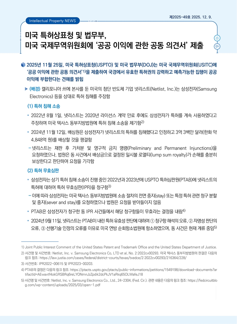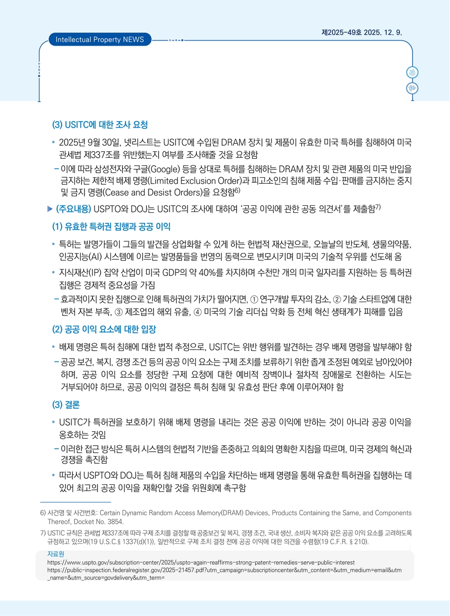 미국 특허상표청 및 법무부, 미국 국제무역위원회에 ‘공공 이익에 관한 공동 의견서’ 제출