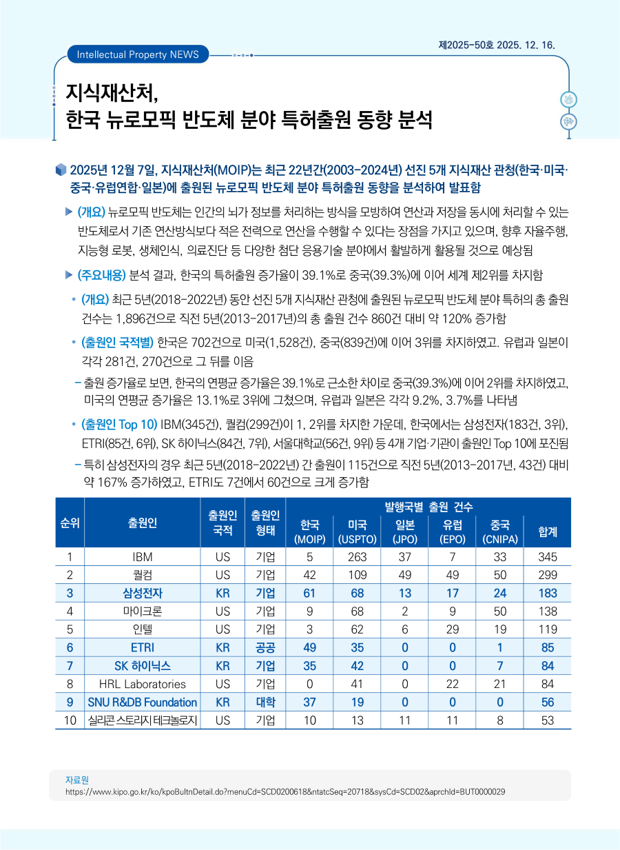지식재산처, 한국 뉴로모픽 반도체 분야 특허출원 동향 분석