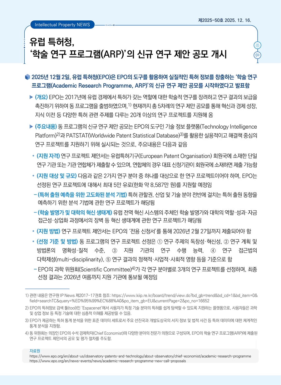 유럽 특허청, ‘학술 연구 프로그램(ARP)’의 신규 연구 제안 공모 개시