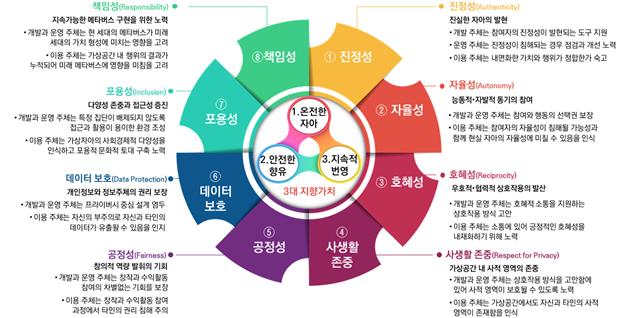 - (개요) 과학기술정보통신부는 확장가상세계의 내부 저작권, 개인정보, 재산권 등의 보호 필요성을 감안하여, 관계 부처와 산업계를 중심으로 확장가상세계를 개발, 운영, 이용하는 참여자가 지켜야할 규범을 마련함 - (주요내용) '확장가상세계 윤리원칙' 초안의 주요내용은 다음과 같음 ∙ 과학기술정보통신부, 여성가족부, 교육부, 외교부, 방송통신위원회, 경찰청 등 정부 부처와 산업계, 법조계, 학계, 확장가상세계 관련 기관 등에 속한 17명의 위원은 ‘확장가상세계 윤리원칙’ 초안에 대하여 토론함 ∙ ‘확장가상세계 윤리원칙’은 ‘3대 지향가치’를 통해 생태계 참여자가 확장가상세계를 개발, 운영, 이용하는데 필요한 목표를 확립했으며, 목표 실현을 위한 의사결정과 행동의 기준인 ‘8대 실천원칙’을 구성함 ∙ ‘3대 지향가치’는 ① 온전한 자아, ② 안전한 향유, ③ 지속적 번영을 의미하며, ‘8대 실천원칙’에는 ‘진정성’, ‘자율성’, ‘호혜성’, ‘사생활 존중’, ‘공정성’, ‘데이터 보호’, ‘포용성’, ‘책임성’이 있음 ∙ 과학기술정보통신부는 ‘확장가상세계 윤리원칙’이 학교 교육이나 확장가상세계를 운영하는 기업에서 커뮤니티 지침으로 활용될 수 있도록 관련 부처, 전문가, 기업, 시민단체 등의 의견 수렴을 거쳐 최종안을 마련할 예정임