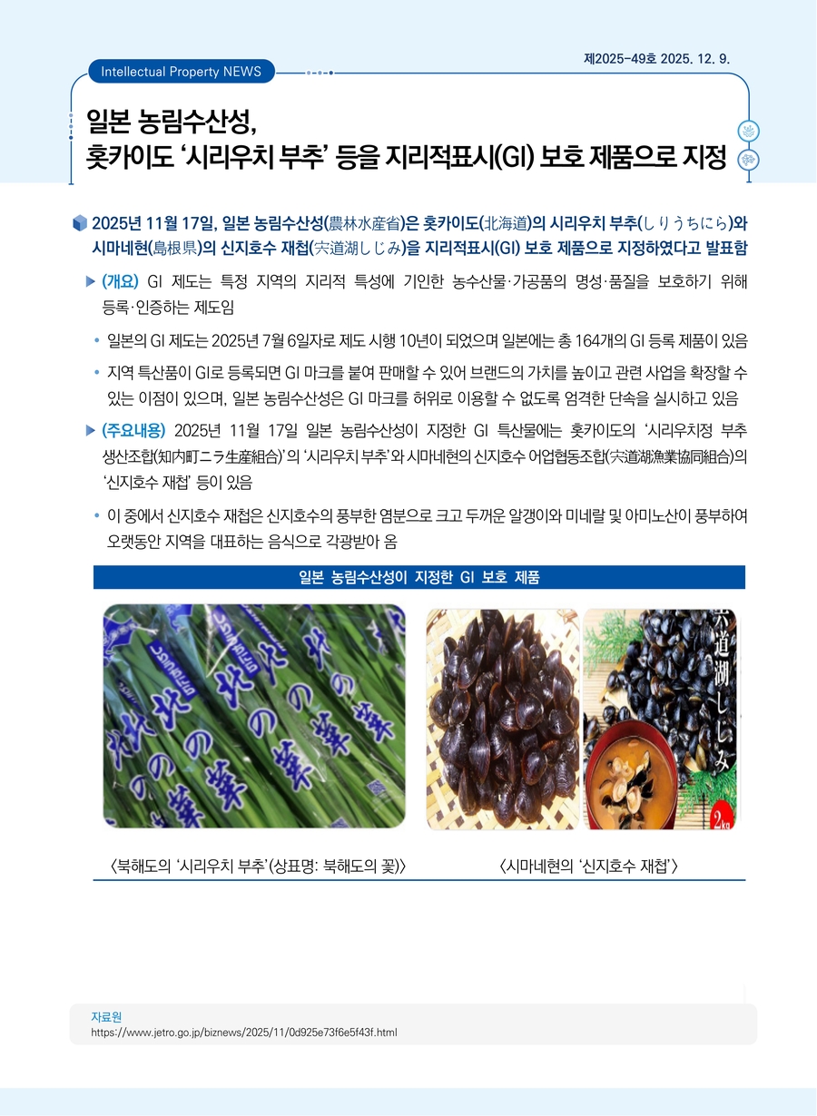 일본 농림수산성, 홋카이도 ‘시리우치 부추’ 등을 지리적표시(GI) 보호 제품으로 지정