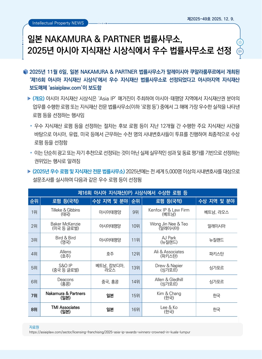 | 일본 NAKAMURA & PARTNER 법률사무소, 2025년 아시아 지식재산 시상식에서 우수 법률사무소로 선정 |