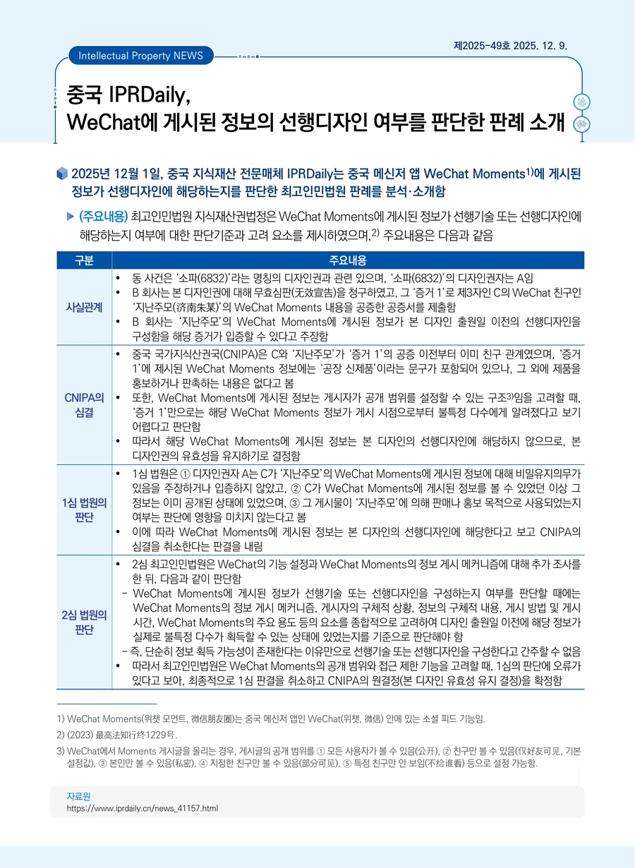 중국 IPRDaily, WeChat에 게시된 정보의 선행디자인 여부를 판단한 판례 소개
