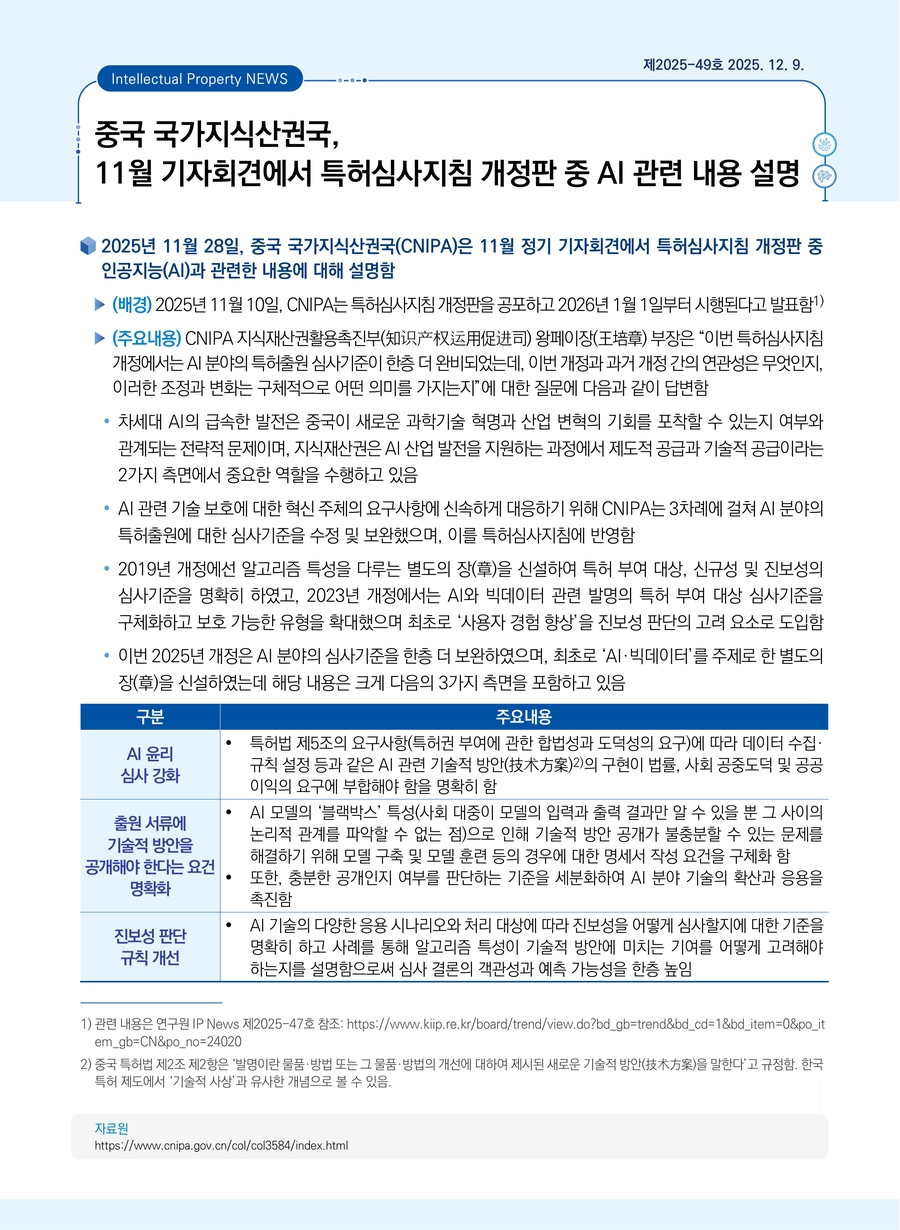 중국 국가지식산권국, 11월 기자회견에서 특허심사지침 개정판 중 AI 관련 내용 설명