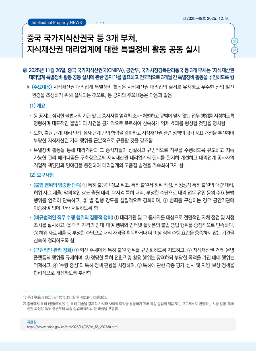 중국 국가지식산권국 등 3개 부처, 지식재산권 대리업계에 대한 특별정비 활동 공동 실시
