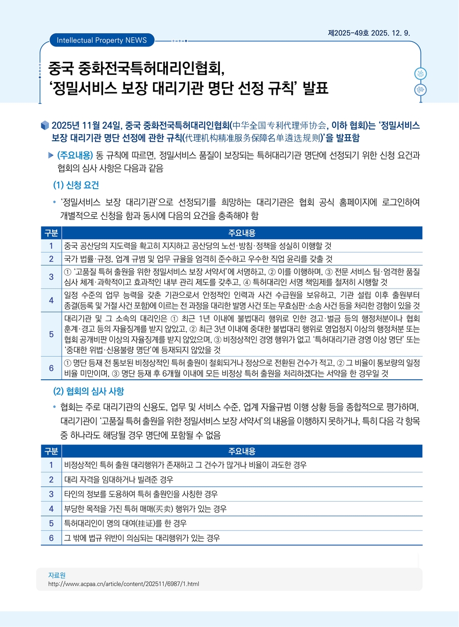 중국 중화전국특허대리인협회, ‘정밀서비스 보장 대리기관 명단 선정 규칙’ 발표
