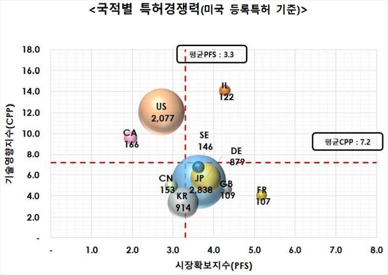 ∙ 한편, 미국 등록특허를 기준으로 국적별 경쟁력을 살펴보면, 미국은 ‘기술영향지수’1)가 높아 완전 자율주행차 개발에 우위를, 일본은 ‘시장확보지수’2)가 높다는 점에서 시장 선점에 강점이 있고, 한국은 ‘시장확보지수’는 평균 수준이나 ‘기술영향지수’가 상대적으로 낮음 1) ‘기술영향지수’란 해당 특허권자의 등록 특허들이 후속 특허들에 의해 평균적으로 인용된 횟수를 말함. 2) ‘시장확보지수’란 해당 특허권자의 등록 특허 수 대비 패밀리 진입국가 수를 말함. |