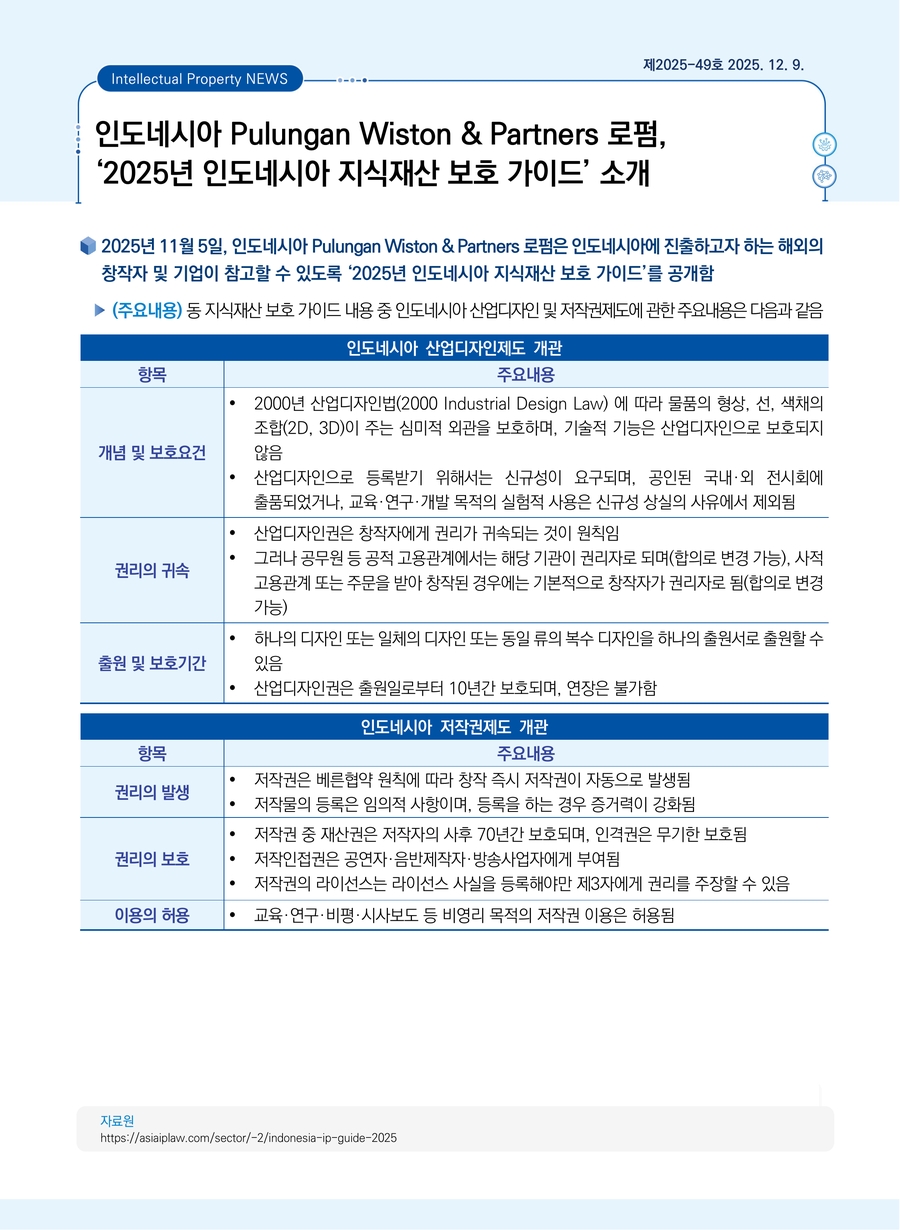 | 인도네시아 Pulungan Wiston & Partners 로펌, ‘2025년 인도네시아 지식재산 보호 가이드’ 소개 |