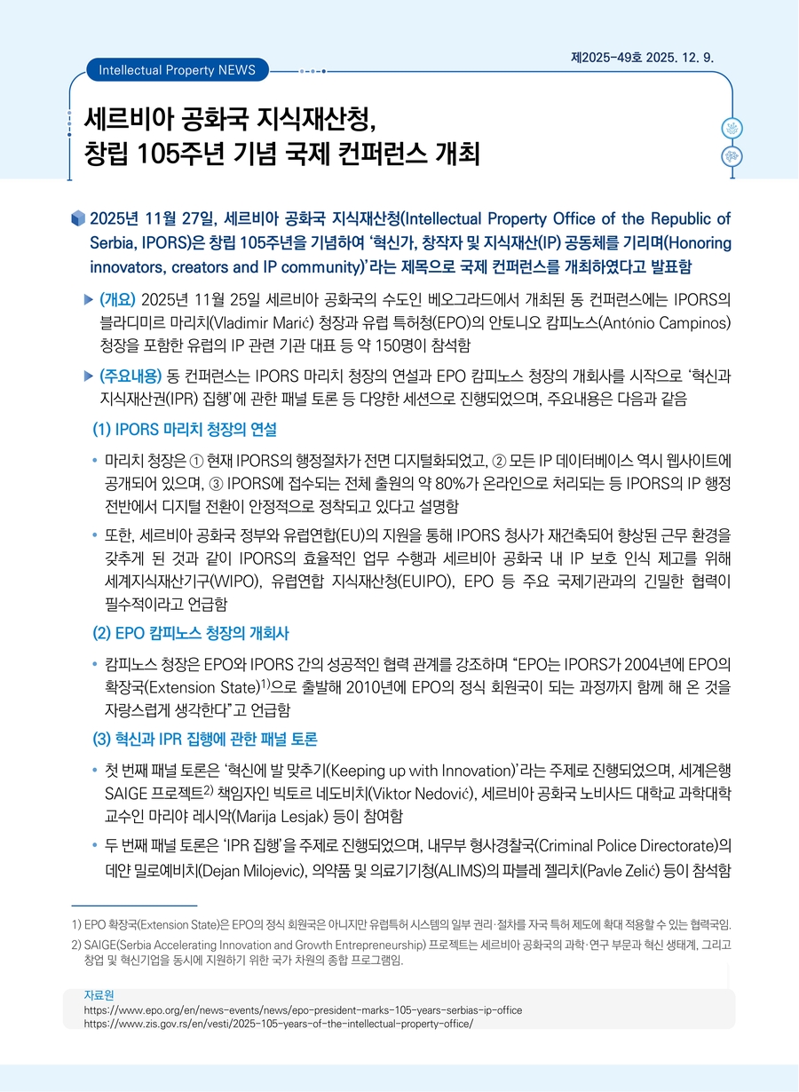 세르비아 공화국 지식재산청, 창립 105주년 기념 국제 컨퍼런스 개최
