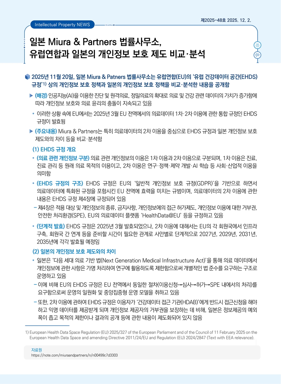 | 일본 Miura & Partners 법률사무소, 유럽연합과 일본의 개인정보 보호 제도 비교·분석 |