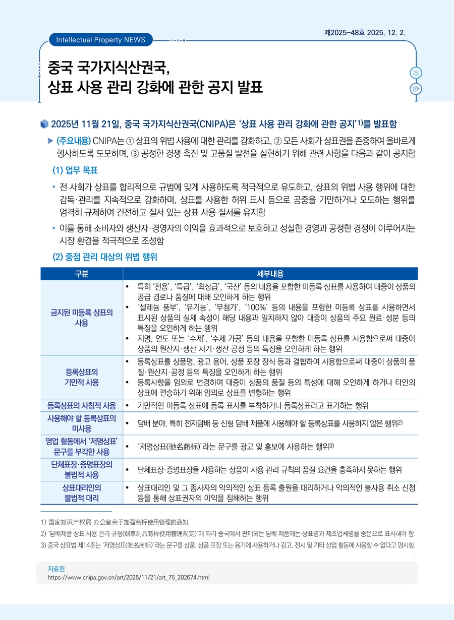 중국 국가지식산권국, 상표 사용 관리 강화에 관한 공지 발표
