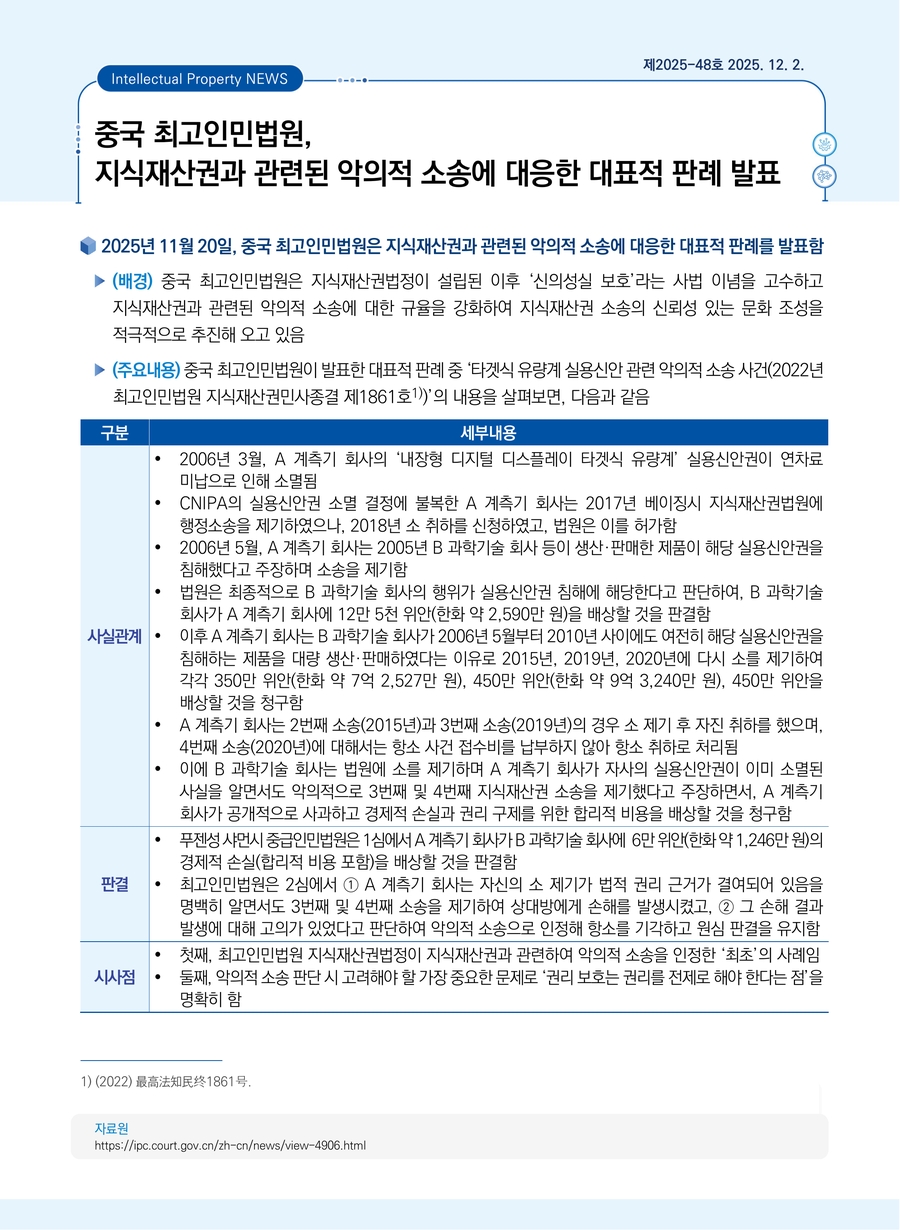중국 최고인민법원, 지식재산권과 관련된 악의적 소송에 대응한 대표적 판례 발표