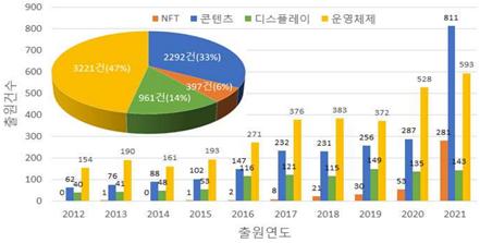 - (개요) 코로나19에 따른 비대면 디지털 사회가 본격화되면서 미래 먹거리로 메타버스1)가 주목받고 있으며, 대체 불가능 토큰(NFT)2)은 메타버스에서 디지털 자산의 관리, 인증, 보안 등을 위한 기술임 · KIPO는 메타버스 시장의 성장과 관련해 전 세계 주류문화로 성장한 대중음악, 게임 등 K-콘텐츠가 메타버스로 확장되면서 디지털 자산화에 대한 고민이 지식재산 출원으로 이어진 것으로 판단함 - (주요내용) 메타버스 관련 특허는 최근 10년 간(2012년~2021년) 연평균 24% 증가하였으며, 특히 2021년 에는 1,828건이 출원되어 전년대비 약 2배 증가함 · 디지털 자산의 관리, 인증, 보안 등을 위한 NFT 관련 특허는 2017년부터 본격적인 출원이 시작되어 최근 5년 간(2017년~2021년) 연평균 143% 증가하였으며, 2021년에는 전년대비 5.3배 이상 폭증함 · 학습, 쇼핑, 건강, 게임 등 메타버스 콘텐츠 관련 출원은 최근 5년 간(2017년~2021년) 연평균 37%의 증가율을 보였으며, 2021년에는 전년대비 2.8배 이상 급증함