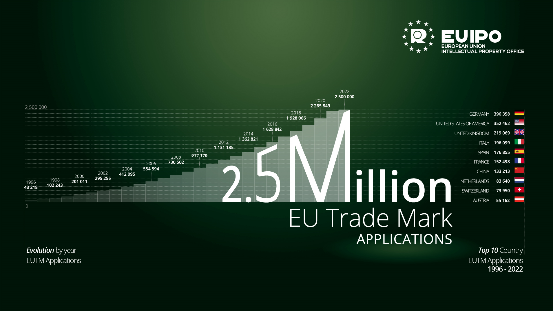 • 2022년 3월 21일, 유럽연합 지식재산청(EUIPO)은 유럽연합 상표(European Union Trade Mark, EUTM)의 출원이 누적(1996-2022년) 250만 건을 달성하였다고 발표함