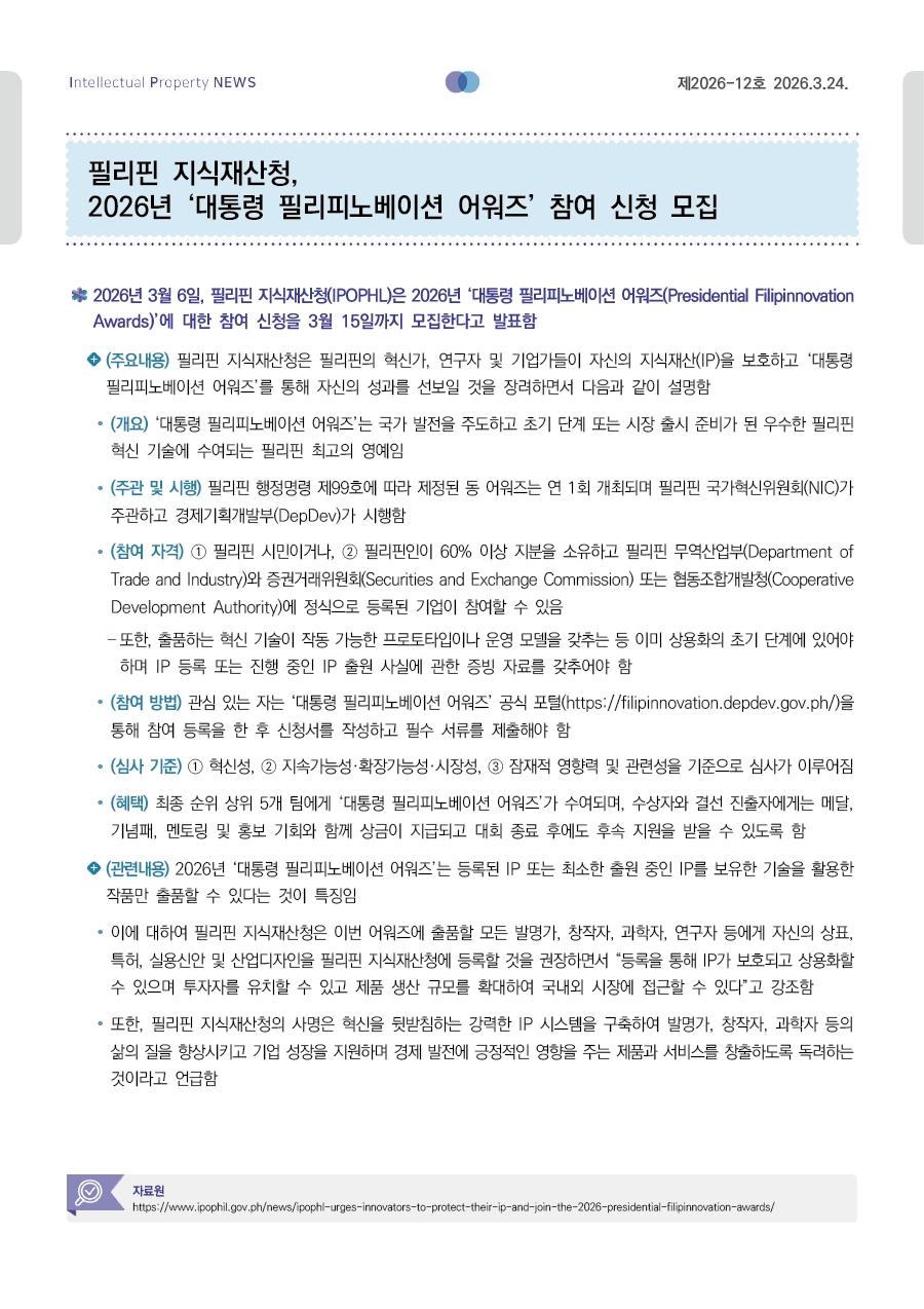 필리핀 지식재산청, 2026년 ‘대통령 필리피노베이션 어워즈’ 참여 신청 모집