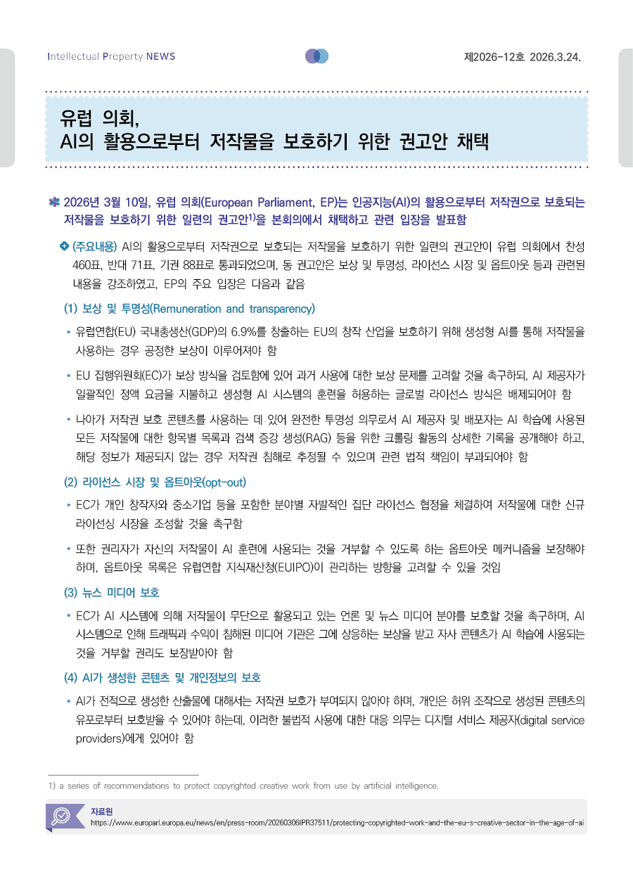 유럽 의회, AI의 활용으로부터 저작물을 보호하기 위한 권고안 채택