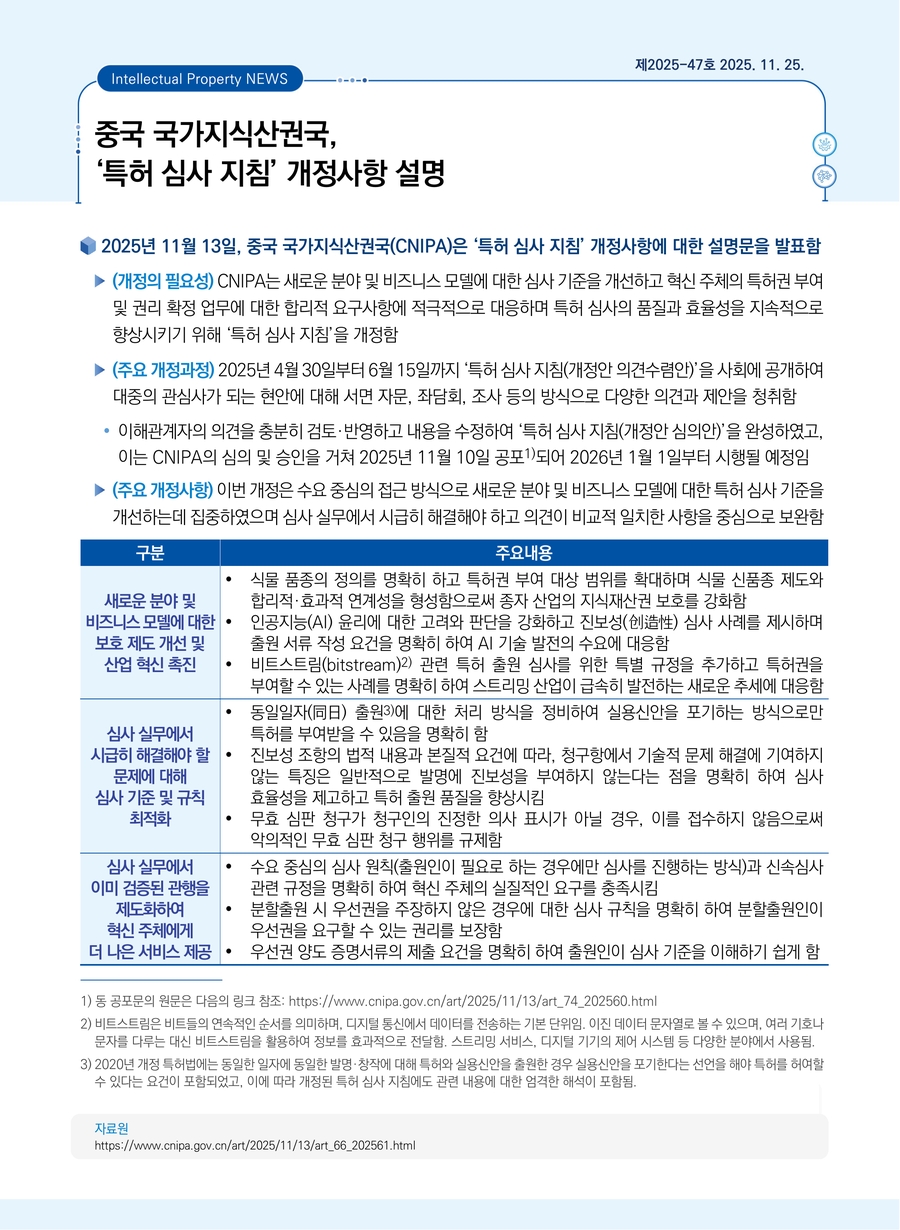 중국 국가지식산권국, ‘특허 심사 지침’ 개정사항 설명