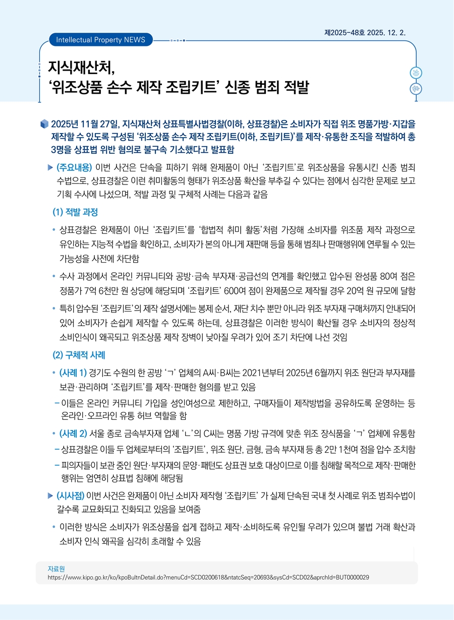 지식재산처, ‘위조상품 손수 제작 조립키트’ 신종 범죄 적발