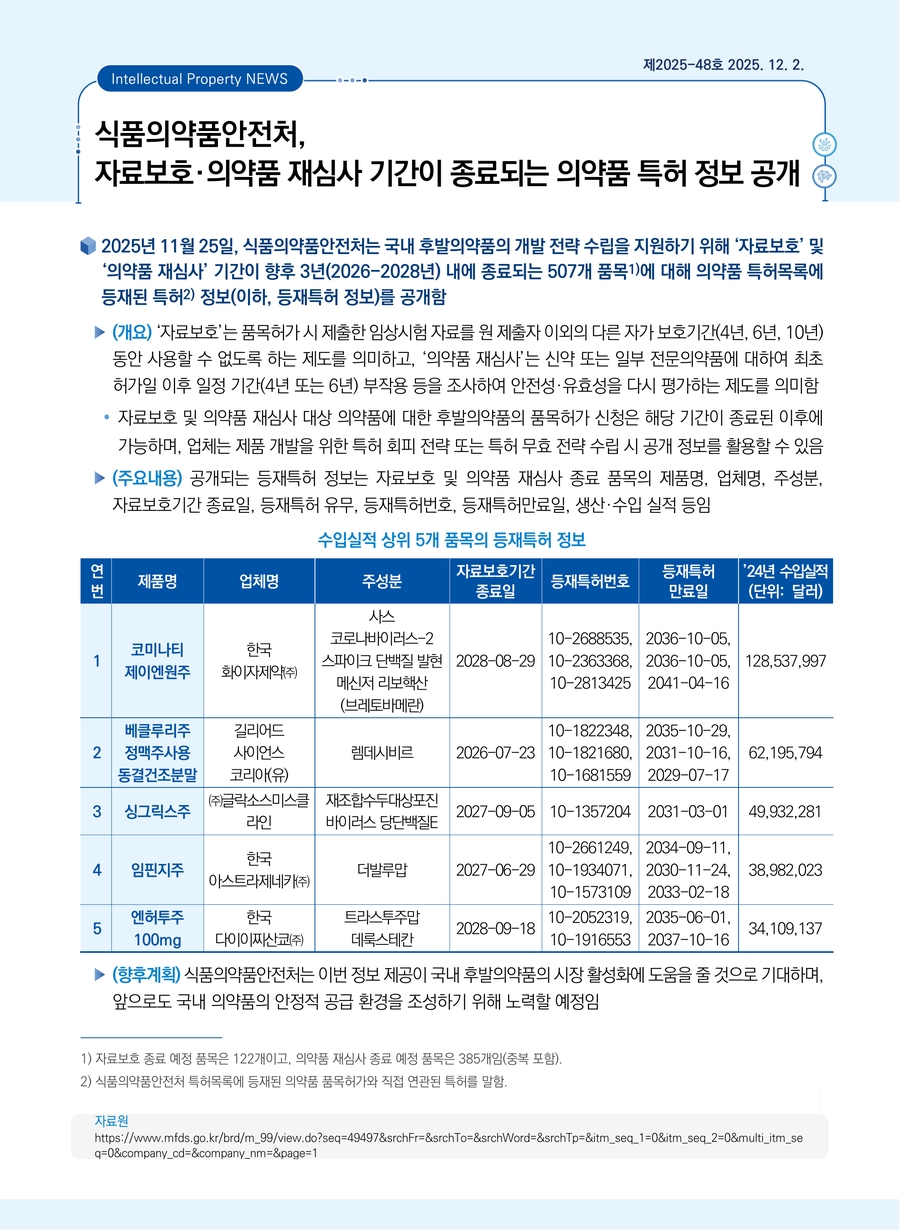 식품의약품안전처, 자료보호·의약품 재심사 기간이 종료되는 의약품 특허 정보 공개
