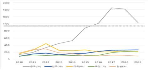 - (개요) 동 간담회는 탄소중립 핵심 분야인 ‘전기차’ 보급 확대를 위한 ‘전기차 충전 기반시설 분야’의 주요 기술, 산업 및 특허 동향을 공유하고 정책방향을 수립하기 위해 마련됨 - (주요내용) 동 간담회는 대기업, 중소기업, 스타트업 및 출연연 등 국내 전기차 충전 기반시설 분야 다출원 기업 12개를 중심으로 구성된 협의체임 ∙ 특허청은 협의체를 통해 세계 전기차 충전 기반시설 특허 동향 등을 지속적으로 산업계와 공유하고, 대·중소기업 및 연구기관 간의 유기적 협력을 통해 전기차 충전 기반시설 산업 육성을 적극 지원할 예정임 ∙ 전기차 충전 기반시설 주요 기술은 초고속 충전, 양방향 충전, 충전 기반시설 관리, 충전 제어, 충전요금 결제, 배터리 점검(monitering) 기술로, 최근 10년간(2010-2019년) 전 세계 전기차 충전 기반시설 주요 기술 분야의 세계 특허 출원은 연평균 14% 증가하고 있음 ∙ 우리나라 출원은 2015년 기점으로 연평균 12%의 높은 증가율을 보이는 가운데, 출원량으로는 2016년부터 미국과 일본을 넘어섰으며, 2019년 연간 출원량(265건)은 중국(1,436건) 다음으로 세계 2위를 유지하고 있음