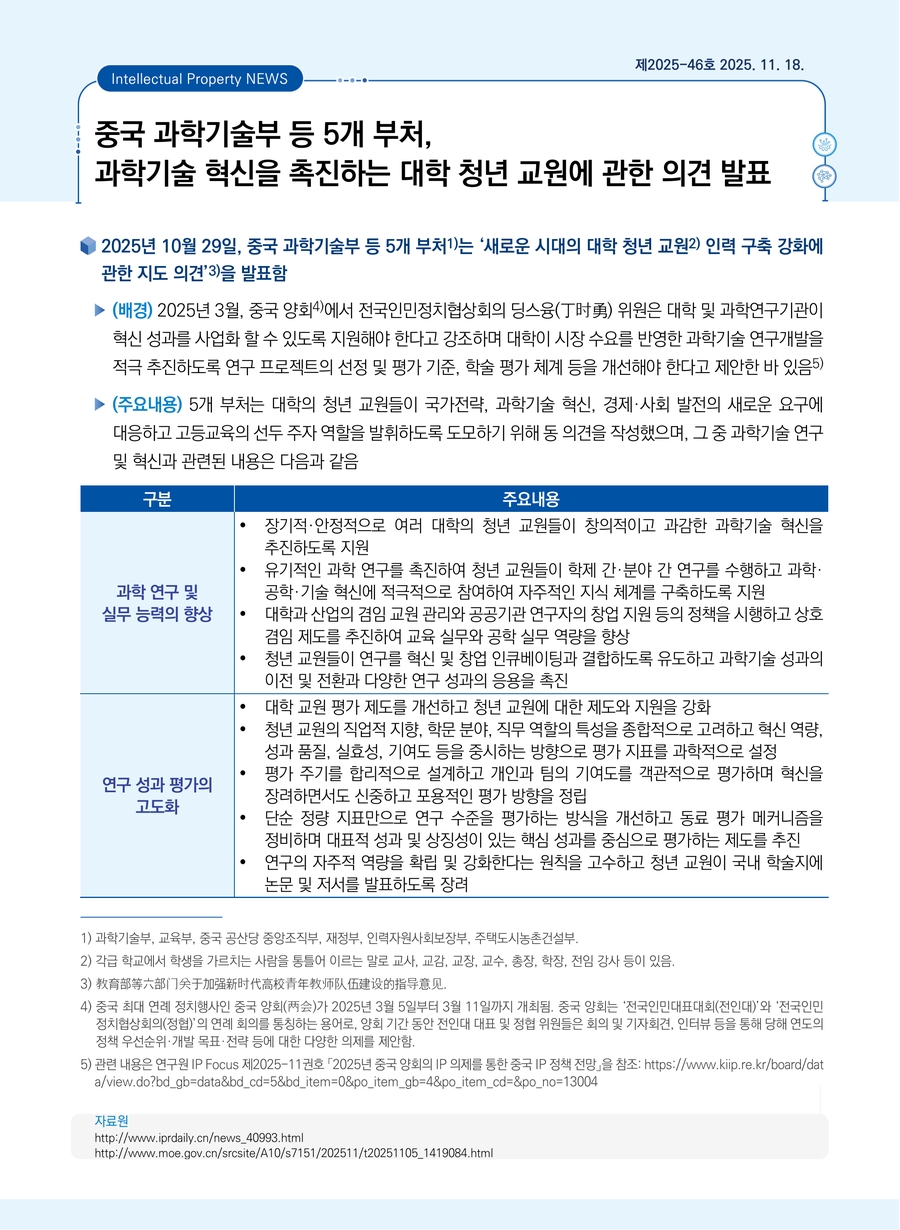 | 중국 과학기술부 등 5개 부처, 과학기술 혁신을 촉진하는 대학 청년 교원에 관한 의견 발표 |