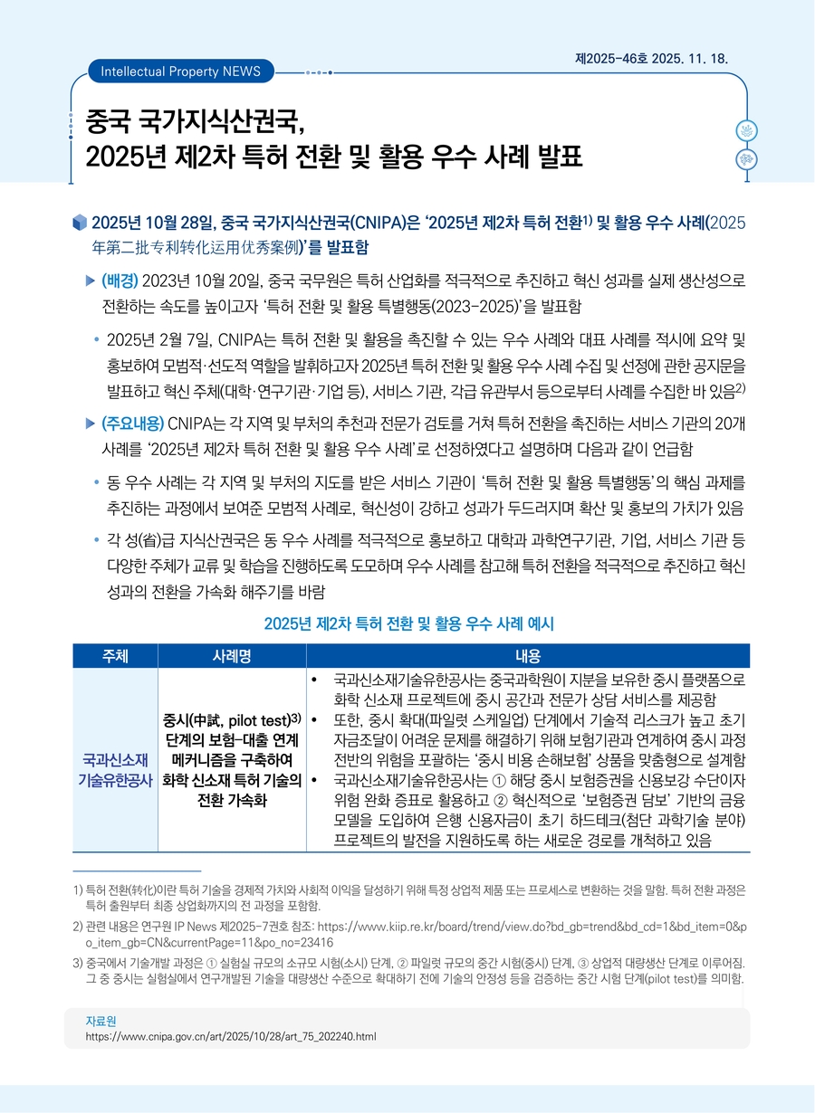 중국 국가지식산권국, 2025년 제2차 특허 전환 및 활용 우수 사례 발표