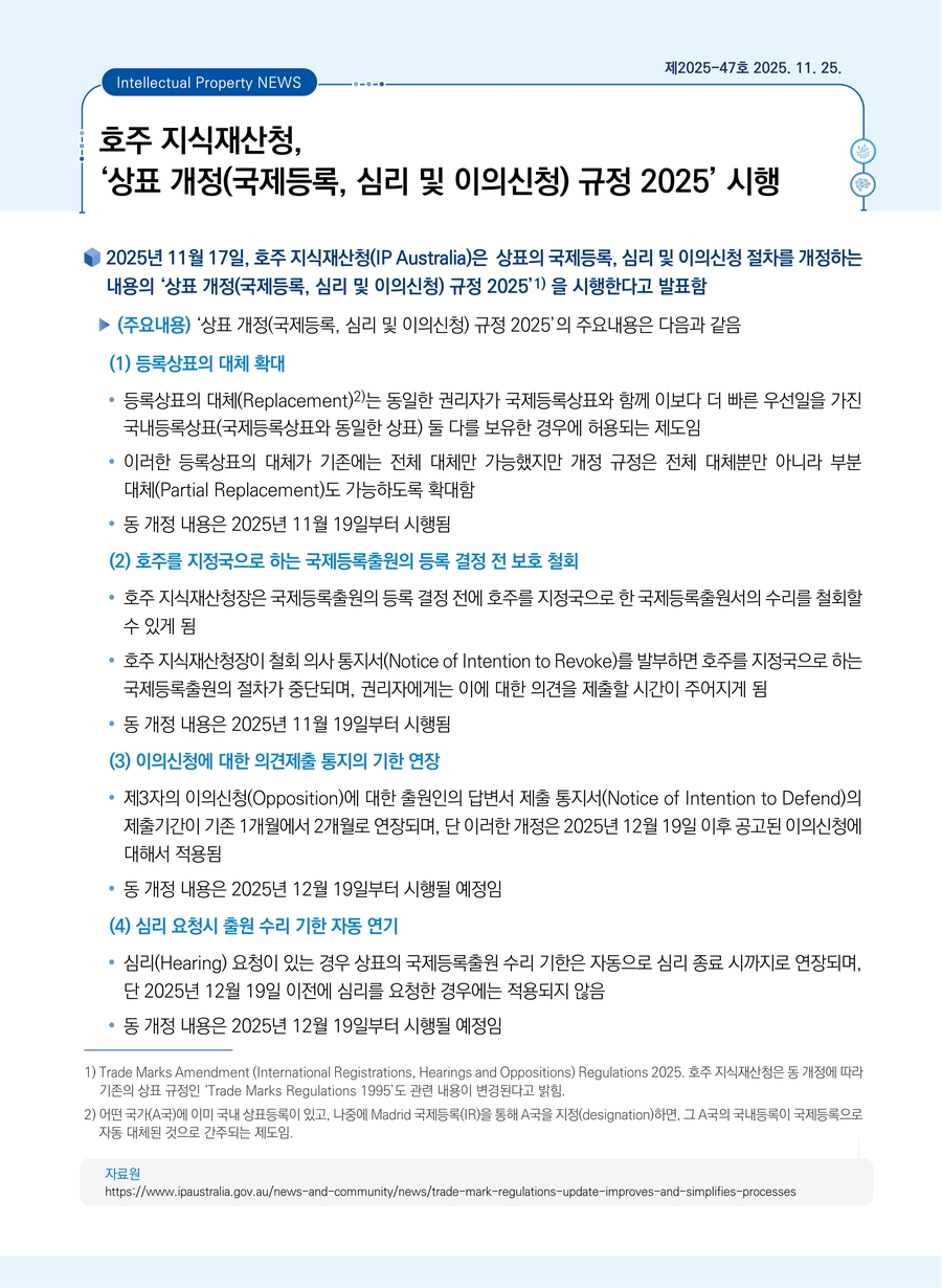 호주 지식재산청, ‘상표 개정(국제등록, 심리 및 이의신청) 규정 2025’ 시행