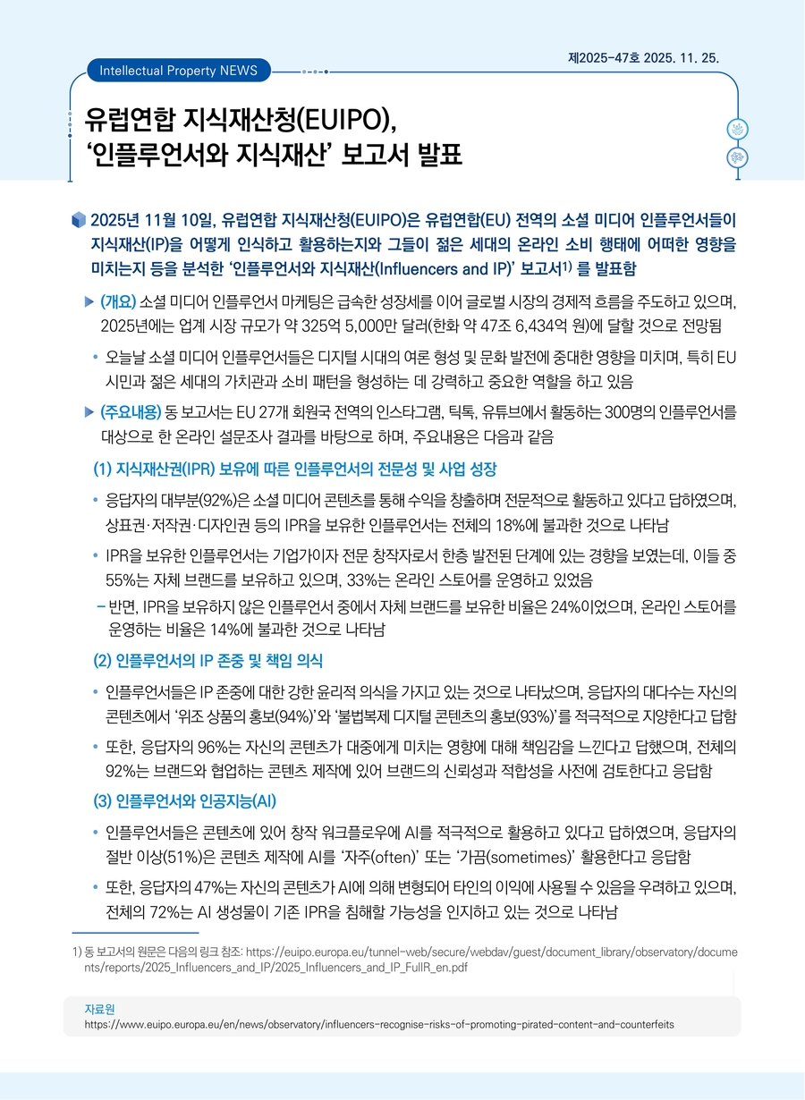 유럽연합 지식재산청(EUIPO), ‘인플루언서와 지식재산’ 보고서 발표