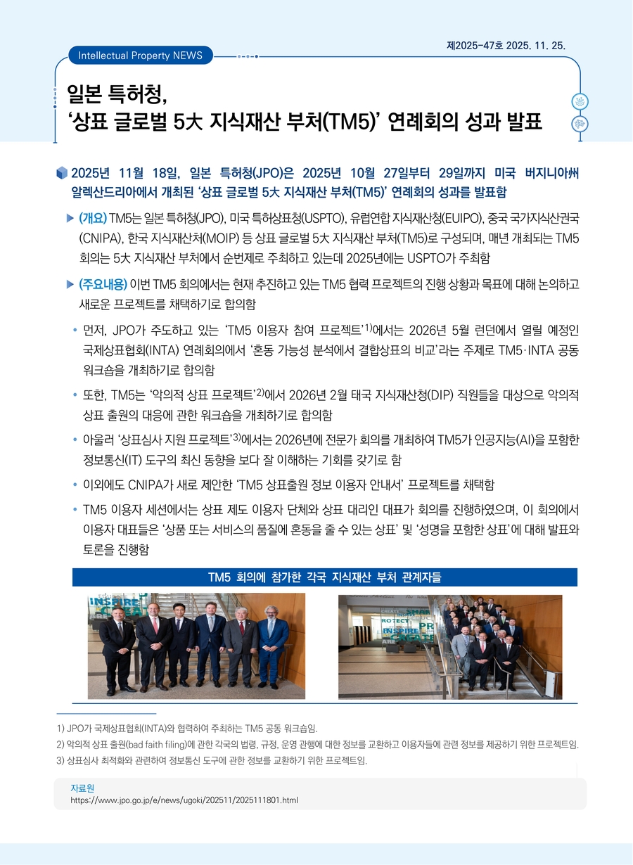일본 특허청, ‘상표 글로벌 5大 지식재산 부처(TM5)’ 연례회의 성과 발표