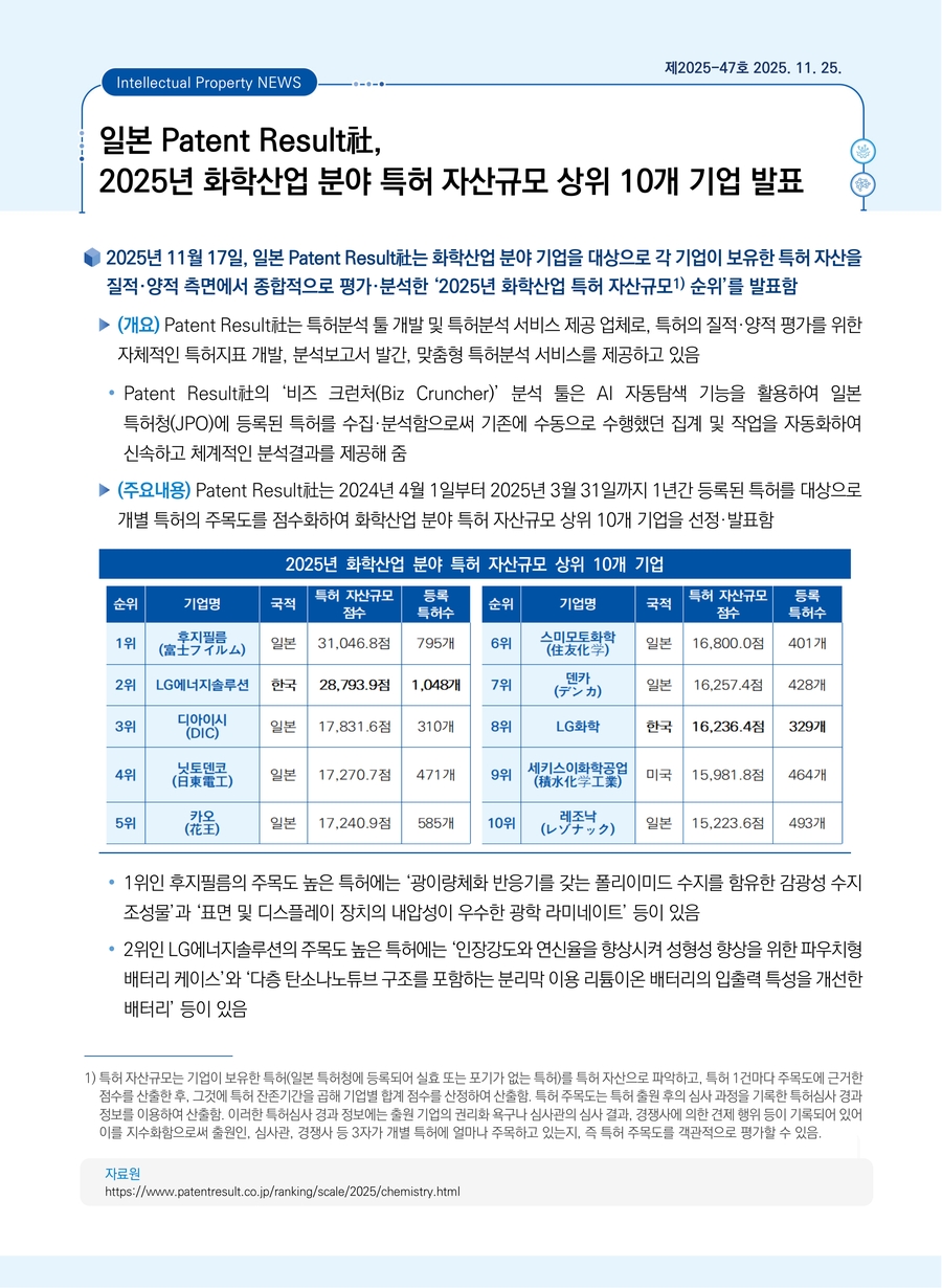 | 일본 Patent Result社, 2025년 화학산업 분야 특허 자산규모 상위 10개 기업 발표 |